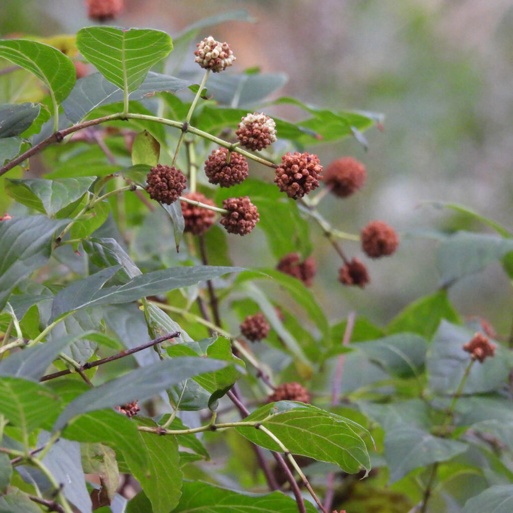 Buttonbush (Cephalanthus occidentalis) is a structural shrub with white blooms in summer followed by red spherical seed heads. They prefer wet to moist soil in sun to part sun where they can grow to be over 8 feet tall and 8 feet wide. They are a good structural plant for slopes and basins of larger plantings. Underplanting species include Emory’s Sedge (Carex emoryi) and White Turtlehead (Chelone glabra).