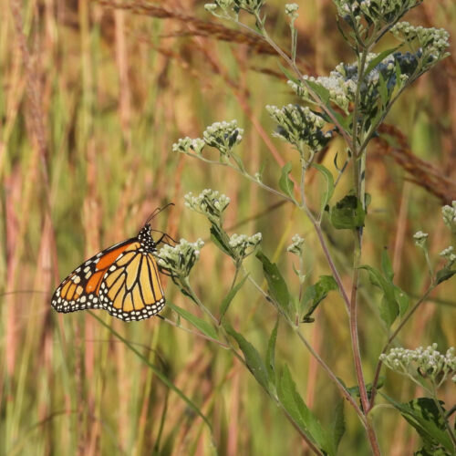 Common Boneset (Eupatorium perfoliatum) is a seasonal or structural plant with white flowers from late summer into fall. They prefer full sun to part sun in moist soil where they grow up to 5 feet tall. They are a good choice for the basins of bioretention plantings. Companion plants include Swamp Milkweed (Asclepias incarnata) and Palm Sedge (Carex muskigemensis).