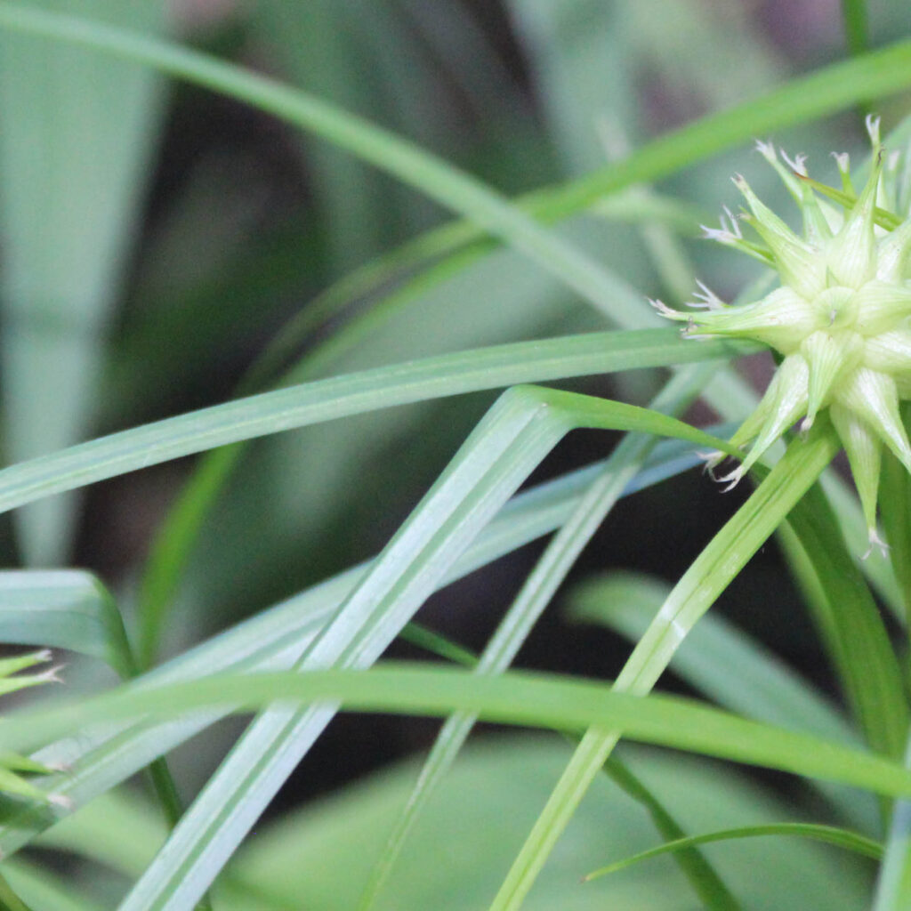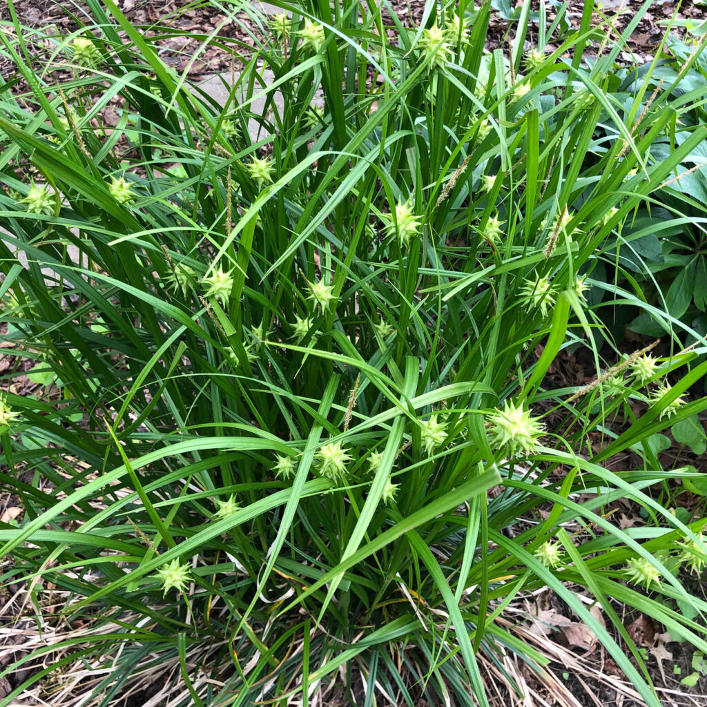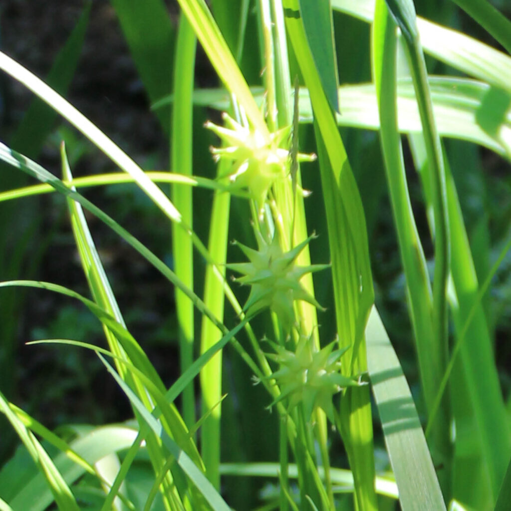 Common Bur Sedge (Carex grayi) is a groundcover plant with grassy foliage that prefers wet to moist soil in sun to part sun but can tolerate some shade. It grows to about 3 feet tall, and colonies form as the plants mature, making them a good choice for groundcovers in basins. Companion plants include Marsh Marigold (Caltha palustris) and Southern Blue Flag Iris (Iris virginica var. shrevei).