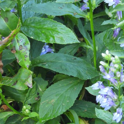 Great Blue Lobelia (Lobelia siphilitica) is a seasonal plant with blue blooms summer into early fall. They prefer moist to mesic soil in sun to part sun but can tolerate some shade. They grow up to 4 feet tall and are a good choice for slopes and basins. Companion plants include ‘Gateway’ Joe Pye Weed (Eutrochium maculatum ‘Gateway’) and Bluestar (Amsonia tabernaemontana).