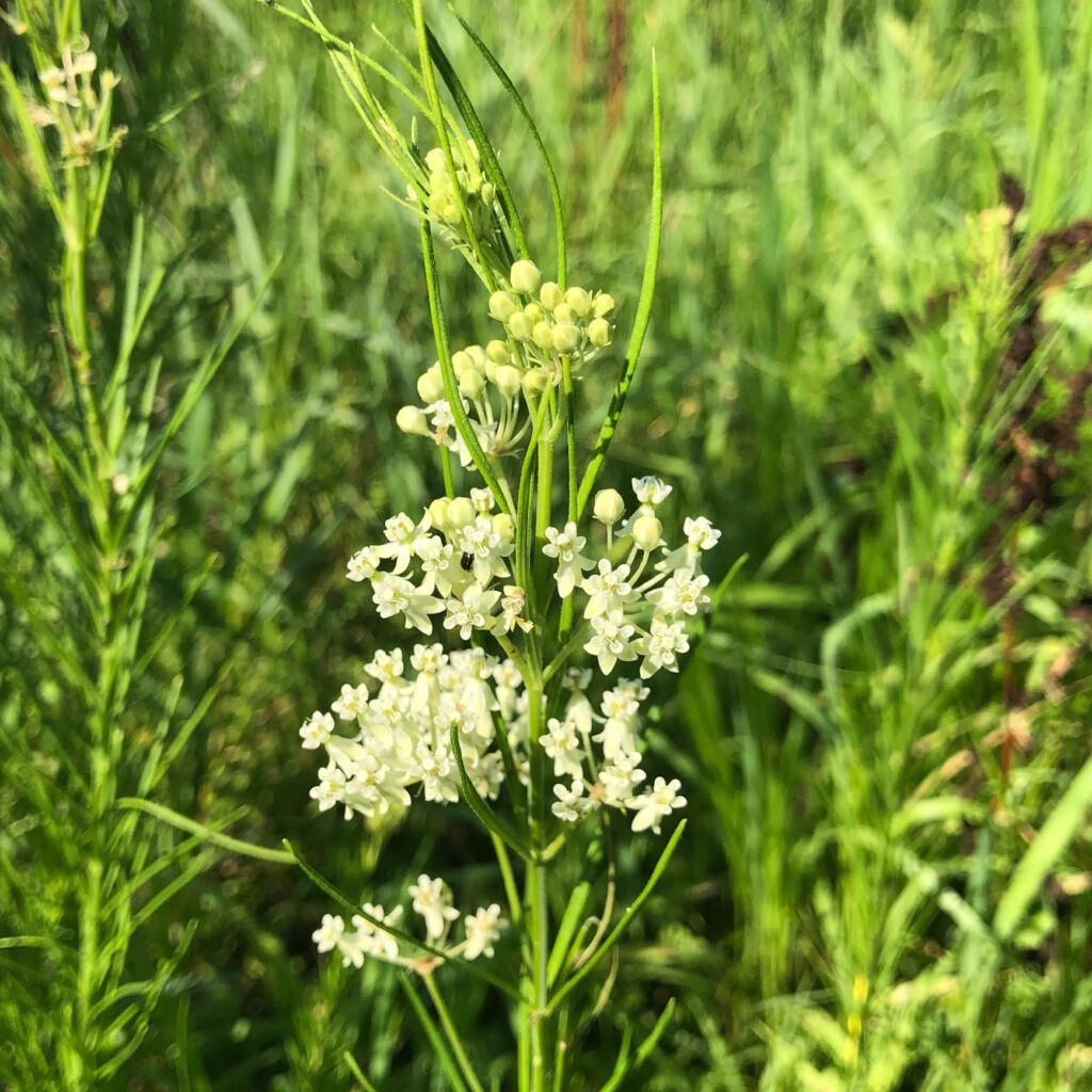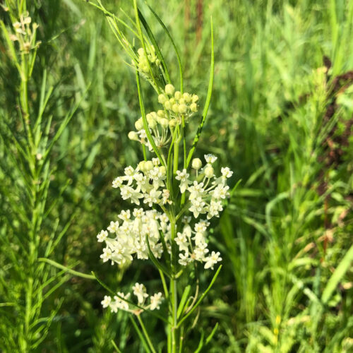 Whorled Milkweed (Asclepias verticillata) is a seasonal interest plant with white flowers from summer into early fall. They prefer dry to mesic soil in full sun where they grow to 2 feet tall. They are a good choice for slopes and banks. Whorled Milkweed is also a host plant for the Monarch butterfly. Companion plants include Prairie Dropseed (Sporobolus heterolepis) and Pale Purple Coneflower (Echinacea pallida).